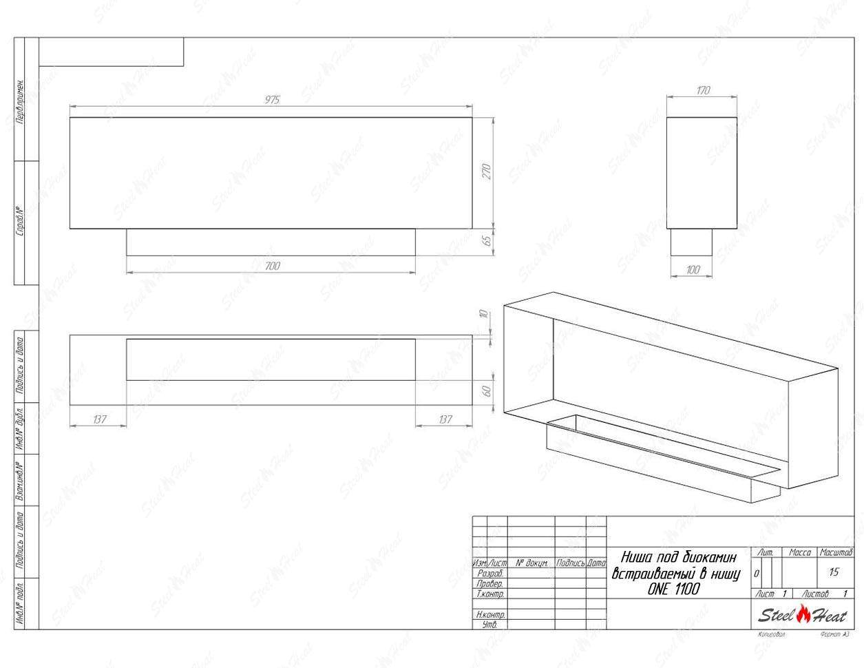 Встраиваемый Биокамин SteelHeat ONE-V 1100 предназначен для встраивания в глухие ниши из гипсокартона, кирпича, пеноблоков, бетона.