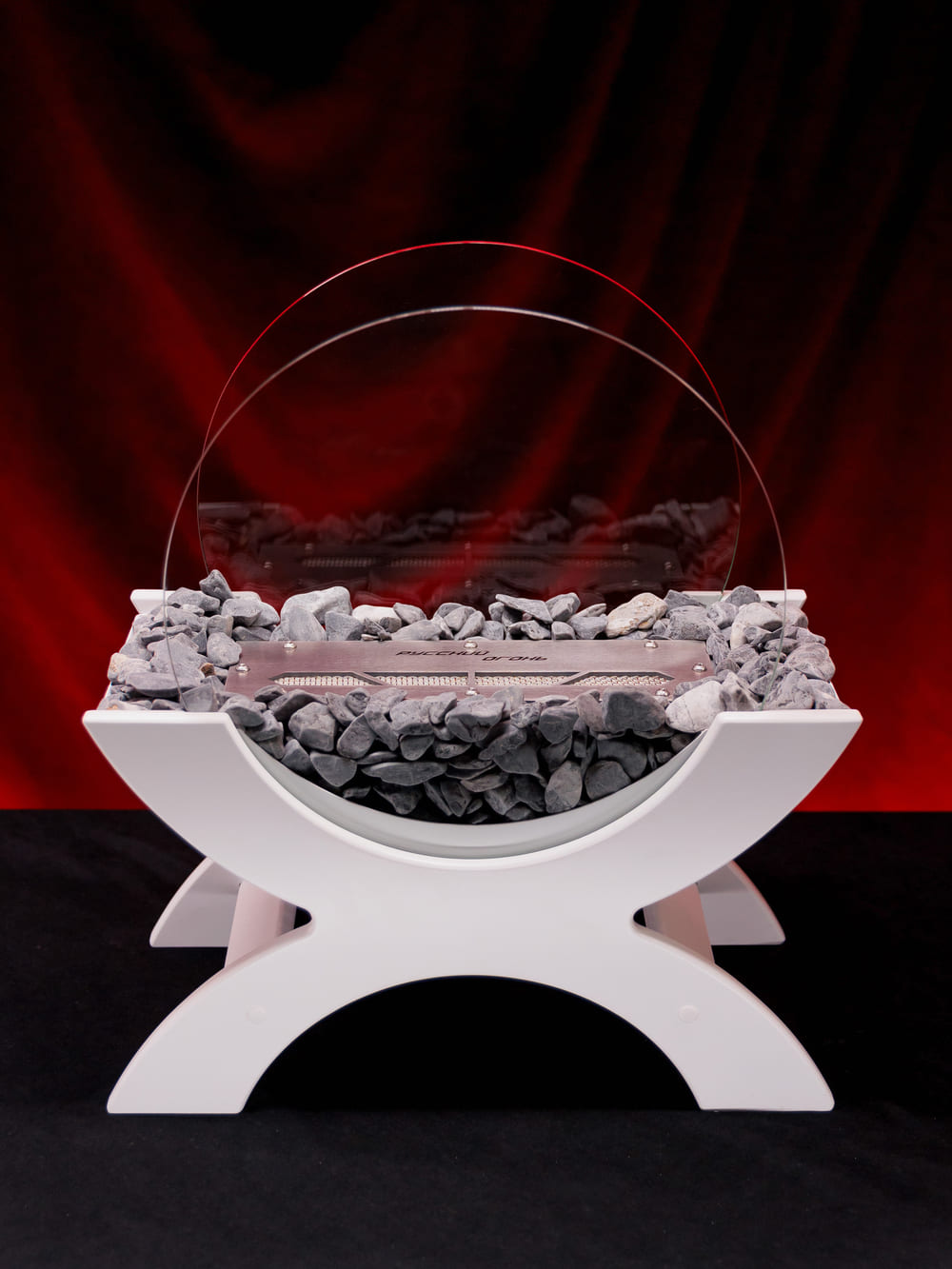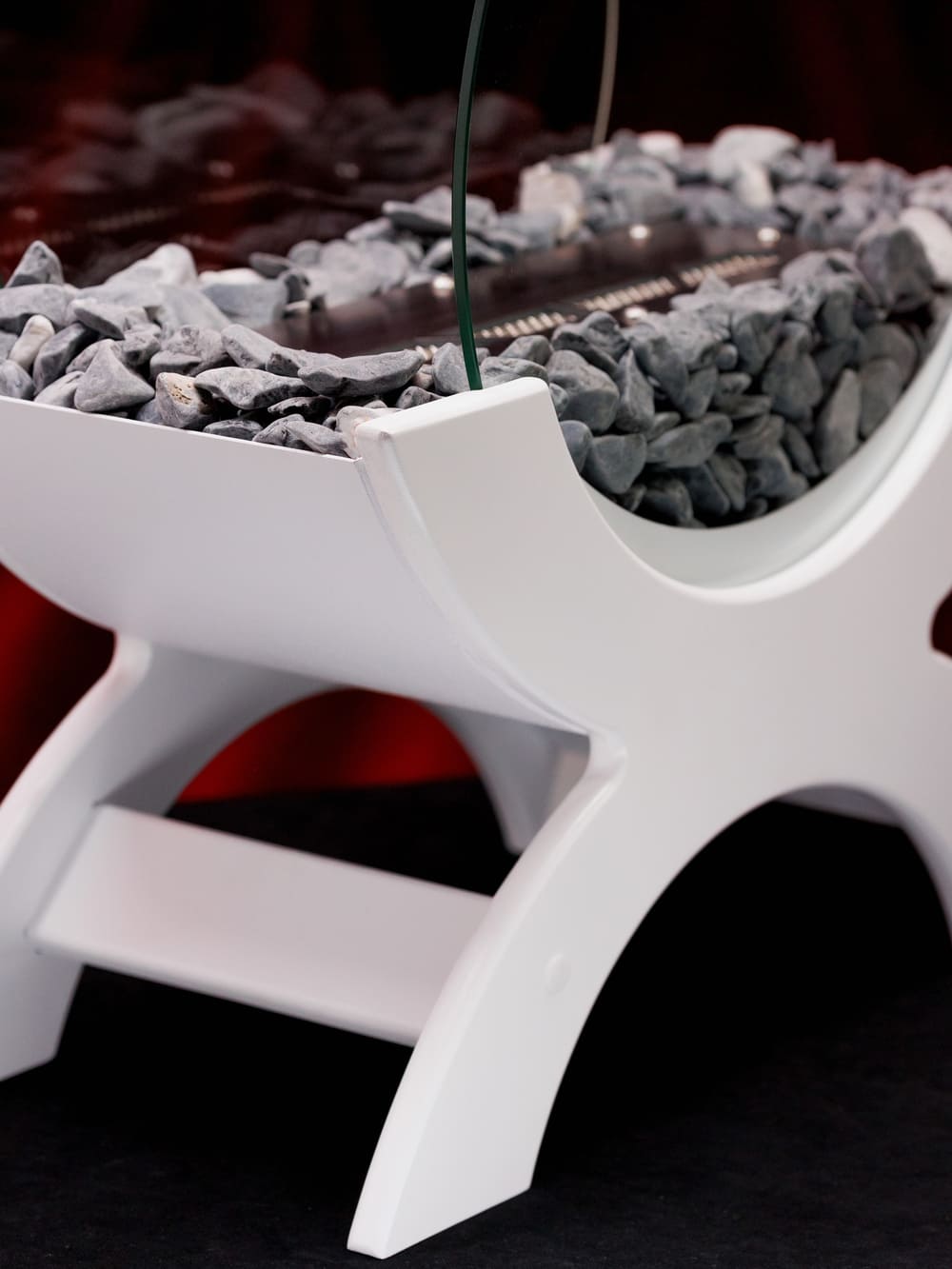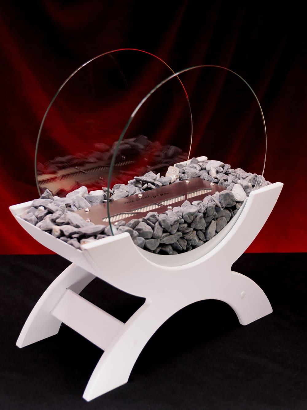 Переносной камин устанавливается на полу и не требует дымохода. Линия огня данного камина 300 мм, располагается практически по всей длине камеры сгорания. Основание биокамина — 100% сталь, ножки изготовлены из МДФ, топливный блок выполнен из высококачественной нержавеющей стали, наполнитель — керамическое волокно, а также закаленные жаропрочные стекла толщиной 6 мм, камни — галтованный мрамор.