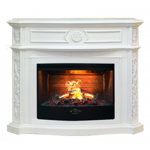 Портал каминокомплекта отличается изящным и шикарным видом. Особенностью его являются развернутые под углом боковые стенки, стилизованные под колонны. Такая форма повторяется при оформлении верхней панели, каминной крышки и основания изделия. Поверхность импровизированных колонн украшена сложным растительным орнаментом. Верхняя их часть, переходящая в панель над очагом, оформлена резными розетками, в дизайне которых также прослеживаются растительные мотивы. Подпирают колонны каминную крышку, кромка которой имеет сложную форму. Панель над очагом украшает резной рисунок в виде цветка. Зону очага и панель разделяет бортик, в передней части имеющий закругленную форму. Устанавливается вся конструкция на невысокое основание, формами повторяющее форму каминной крышки.