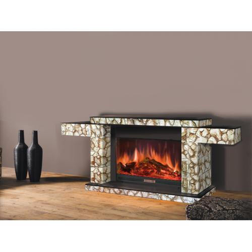 Электрокамин нового ультрасовременного дизайна. Электрокамин идеально подойдет для вашей гостиной в качестве подставки под ТВ. Этот оригинальный электрокамин изготовлен из МДФ со шпоном дуба, венге или ореха. В отделке электрокамина используется камень с мотивом «Карелия». При изготовлении отделки используется ручная работа художников. Необычный, новый, совершенно отличный от принятого восприятия дизайн электрокамина делает его уникальным. В покраске деревянных поверхностей обычно используются краски и морилки, с помощью которых достигается окрас «венге», «антрацит», «красное дерево», также можно заказать любой другой окрас деревянных поверхностей согласно таблице цветов. В электрокамин встроена электротопка «Premier S87», которая имеет очень яркий эффект горения дров в очаге камина, в комплекте электротопка имеет пульт ДУ. Электрокамин имеет двухступенчатую систему обогрева 1000-2000 Вт. В декоративном режиме мощность потребления 80 Вт. Достаточная площадь горизонтальных деревянных поверхностей электрокамина позволит разместить на нем небольшие предметы интерьера, подсвечники, фото в рамочках, любимые декоративные вещицы, абажуры. Электрокамин прекрасно подойдет как подставка под ТВ. Цена указана за комплект - портал + электротопка.