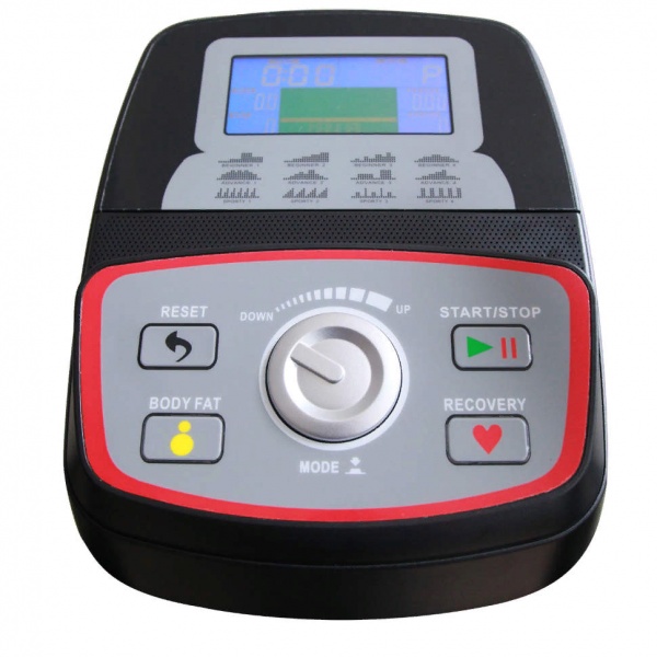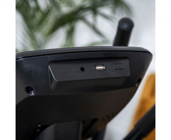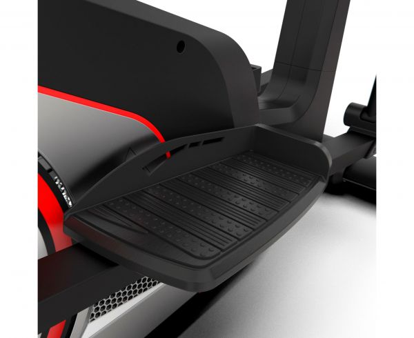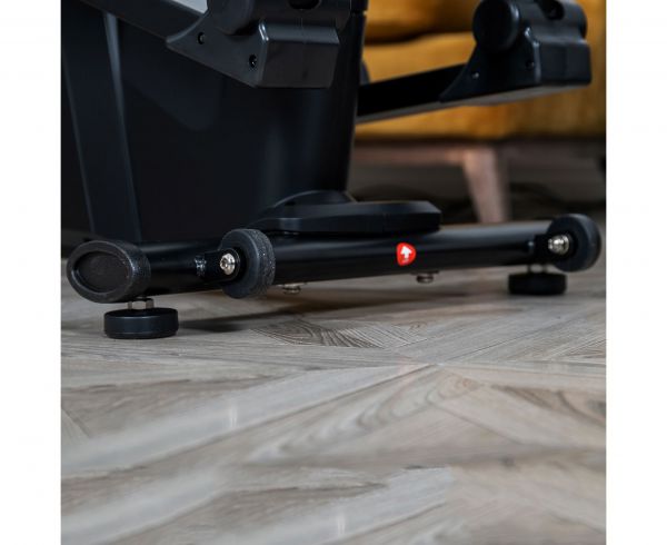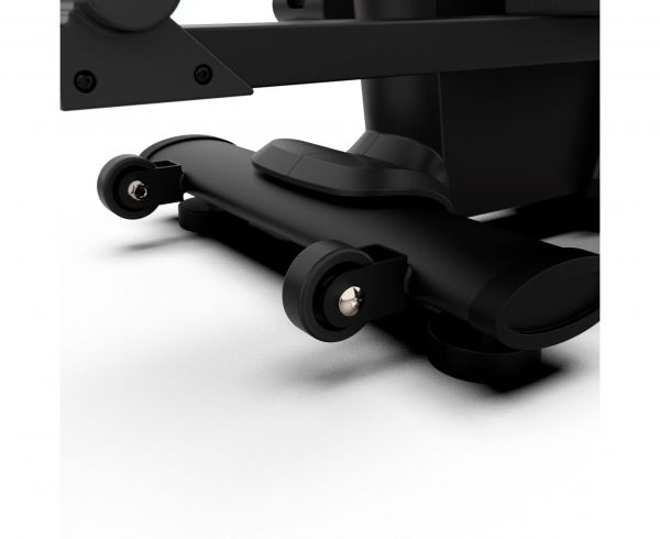 Оснащен датчиками измерения сердечного ритма, расположенными на рукоятках. Тренажер также имеет держатель для планшета и транспортировочные ролики для легкого перемещения после тренировки.